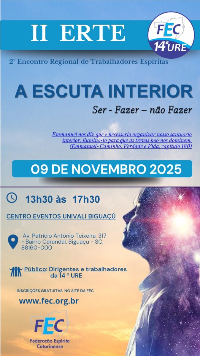 II° ENCONTRO REGIONAL DE TRABALHADORES ESPÍRITAS – ERTE Tema central – A ESCUTA INTERIORTem por objetivo acolher e integrar de forma amorosa e afetiva os trabalhadores […]