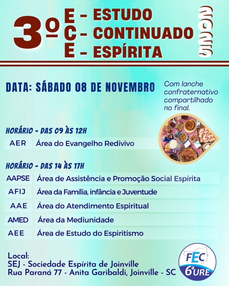 A 3A União Regional Espírita – URE, promove o Seminário “Saúde Mental do Trabalhador Espírita, Depressão e Suicídio” no dia 22.11.2025, das 14h às 17h30. Será […]