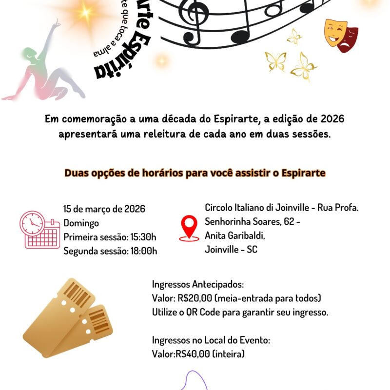 Espirarte 2026 | 10 anos – Evento de Arte Espírita – Apresentações de música, teatro, dança, poesia e jogral. Nessa edição de 10 anos teremos a realização de 1 apresentação de cada ano – serão 10 apresentações artísticas.