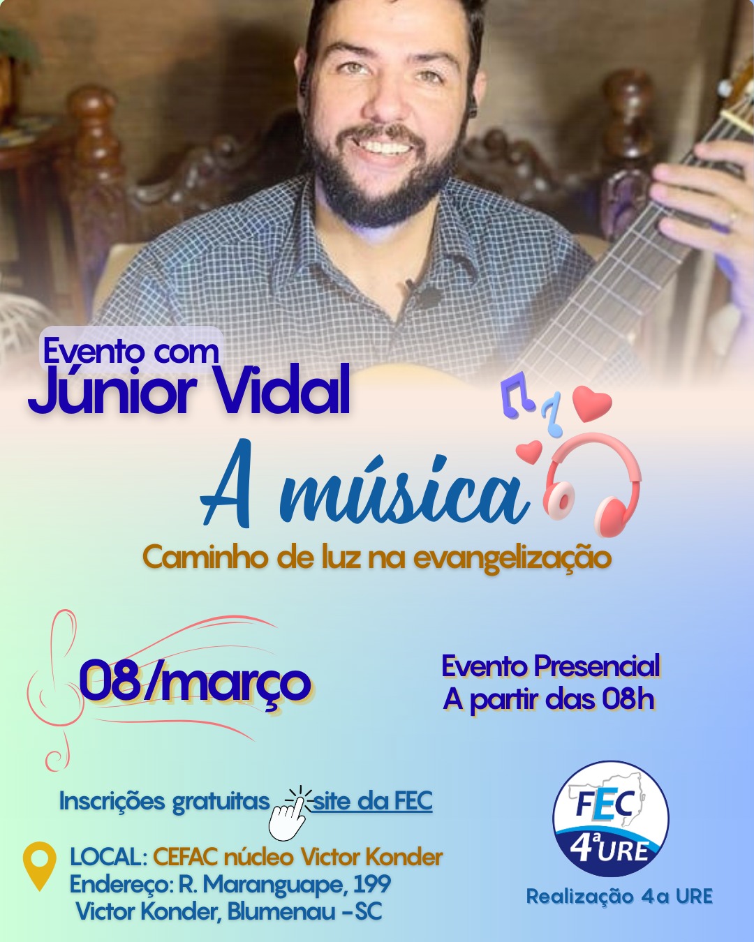 4a URE promove o Evento: A Música Caminho de Luz na Evangelização com Júnior Vidal no dia 08.03.2026