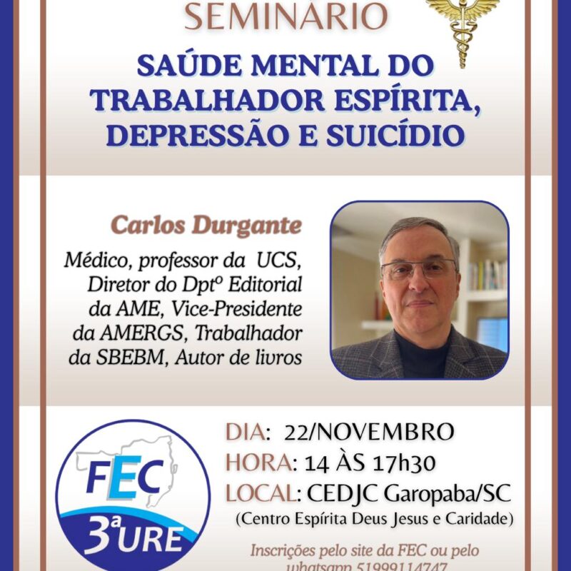 5 de novembro de 2025A 3A União Regional Espírita – URE, promove o Seminário “Saúde Mental do Trabalhador Espírita, Depressão e Suicídio” no dia 22.11.2025, das 14h às 17h30.